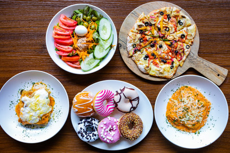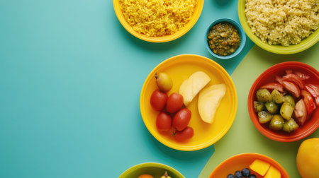 featuring an overhead view of a diverse array of foods. The scene includes various dishes from different cuisines, presented in an appealing and colorful arrangement