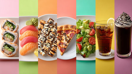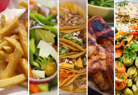 Collage of food, the image show chinese food, hamburger, steak, sushi, hotdog and tzatziki