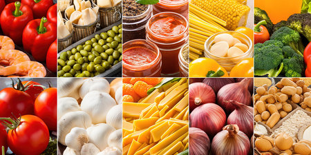 A vibrant display of fresh ingredients showcases an array of colorful foods, perfect for culinary endeavors and gourmet creations, inviting creativity in the kitchen.