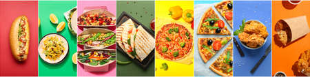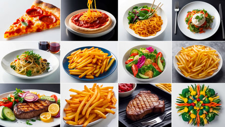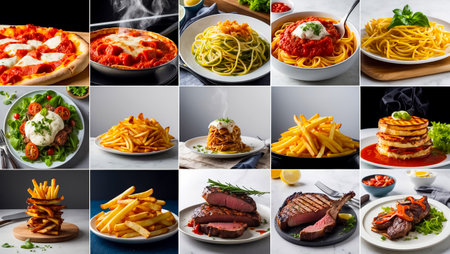 collage of different delicious food, spaghetti, pizza, vegetables, meat