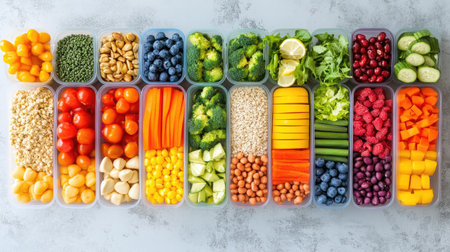 A vibrant display of fresh fruits and vegetables in clear containers, showcasing a healthy lifestyle and nutritious choices perfect for meal preparation or inspiration.