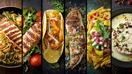 Visually appealing display of different dishes. Ideal for showcasing different cuisines or menu options. Great for social media posts or restaurant marketing materials.