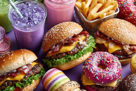 Assortment of fast food including burgers, fries, donuts, and milkshakes