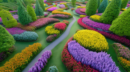 Explore a stunning aerial perspective of a beautiful flower garden filled with vibrant blooms and winding pathways, encapsulating the essence of nature's tranquility and beauty.