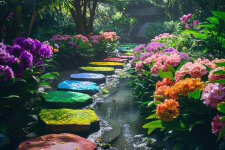 A scenic pathway of colorful stones leads through a lush garden with vibrant flowers and a flowing stream.