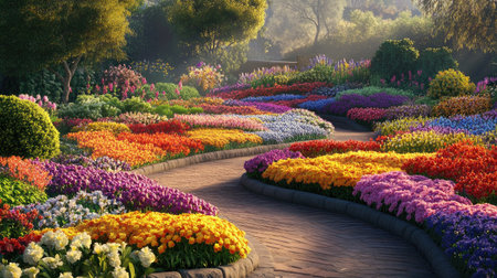 Explore a vibrant garden scene filled with blooming flower beds. This picturesque landscape offers a stunning array of colors, perfect for nature lovers.
