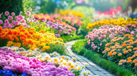 Scenic garden path with colorful flowers blooming on each side, creating a vibrant and peaceful atmosphere