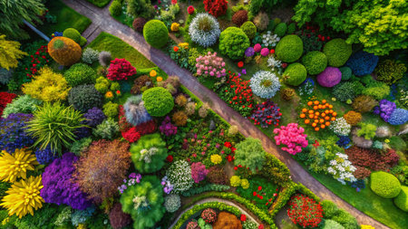 Stunning aerial photograph of a beautifully arranged botanical garden, filled with colorful blooms and lush greenery, creating a tranquil natural oasis.