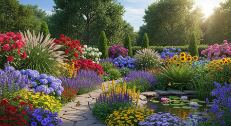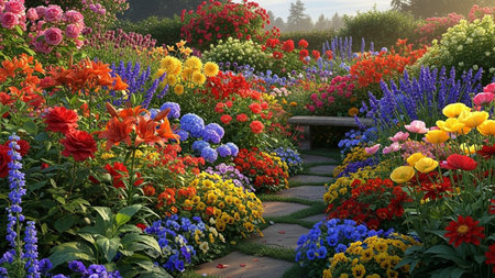 Vibrant flower garden landscape with colorful blossoms in bloom