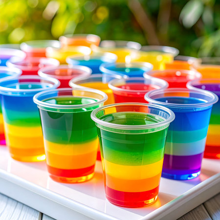 A vibrant, layered gelatin dessert served in a clear cup, showcasing bright colors and an eye-catching arrangement. Perfect for summer parties and celebrations.