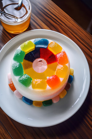 Colorful jelly cake on white plate on wooden table. Top view.