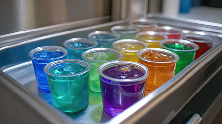A vibrant array of colorful gelatin cups neatly arranged in a metal tray, perfect for parties, gatherings, or festive celebrations. These sweet treats add a playful touch to any event.