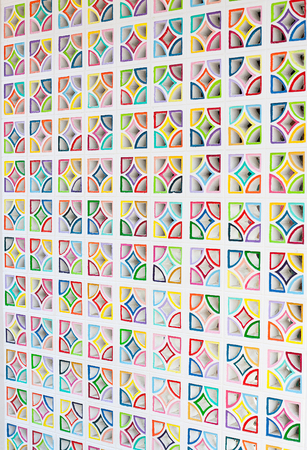 Brightly colored paper pieces are arranged in a detailed geometric pattern on a wall, creating visual interest.