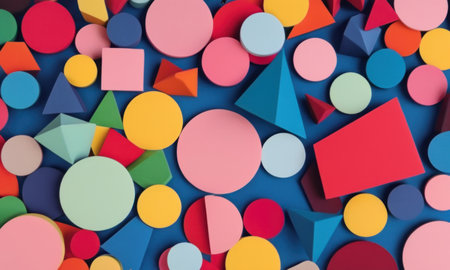 A vibrant assortment of colorful geometric shapes is beautifully displayed on a bright blue background