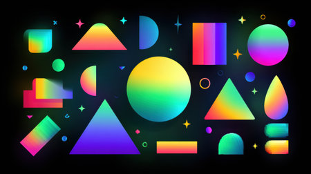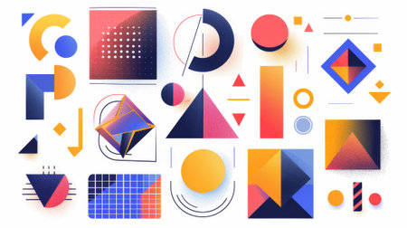 A collection of vivid geometric shapes and patterns in multiple colors showing triangles, circles, and unique designs ideal for artistic backgrounds.