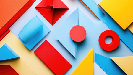 Close-up of geometric shapes made from colorful paper, arranged in an artistic way against a white background. -
