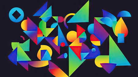 Colorful geometric shapes arranged on a dark background in a vibrant artistic display