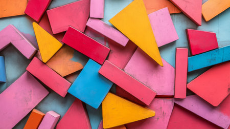 A vibrant collection of colorful geometric shapes scattered on a flat surface, ideal for educational and creative projects, playtime, and art concepts.