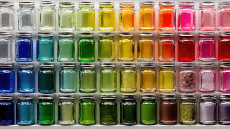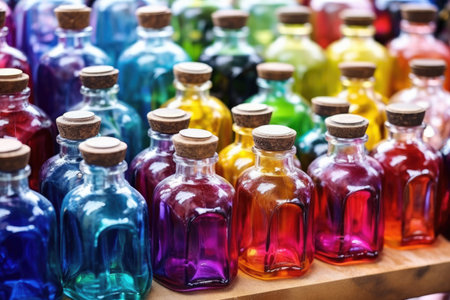 detailed view of textile dyes in glass bottles, created with generative ai