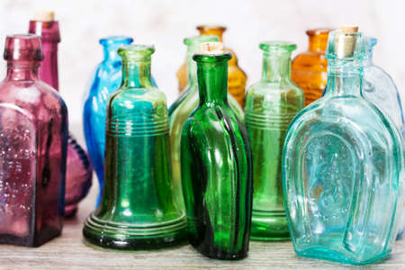 Selection of coloured glass bottles on a rustic background