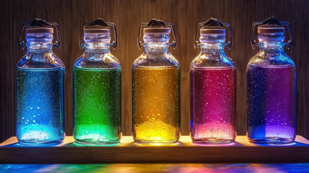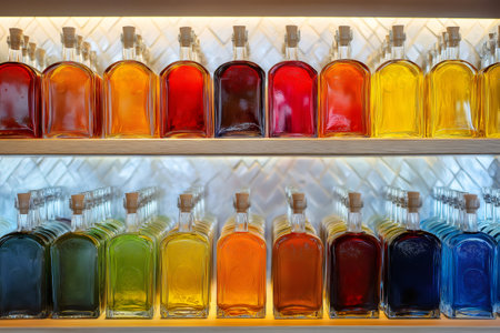 Vibrant glass bottles filled with liquids in various colors are arranged on wooden shelves, creating a visually appealing spectrum of shades and textures for artistic inspiration, AI generated
