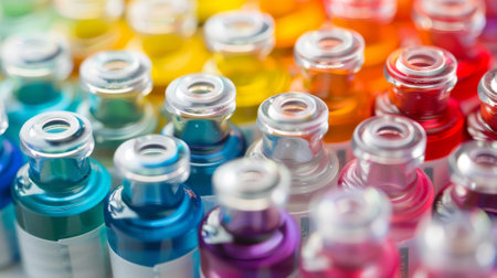 A stunning arrangement of small glass bottles filled with vibrant paints on a textured surface. The soft lighting enhances the rich colors. Perfect for artistic projects.