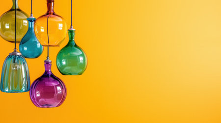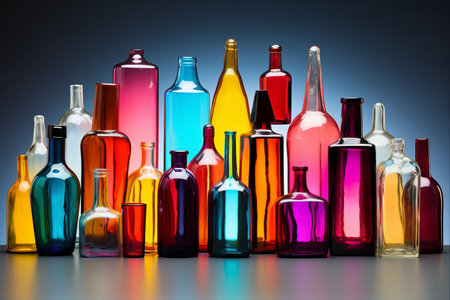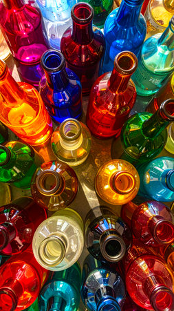 Vibrant and ecofriendly colorful glass bottles collection with a multitude of bright colors, soft light reflections, and transparent textures for recycling, decoration, and interior design purposes
