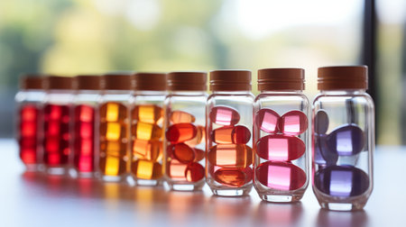 Glass bottles with colorful medicine. Liquid potions and candy in jars. Medical dose medication.