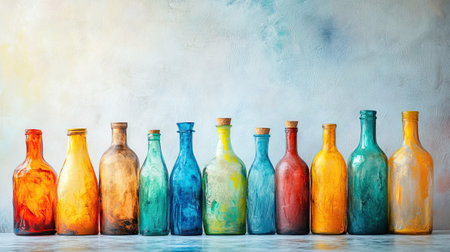 A stunning arrangement of colorful glass bottles against a soft pastel background, creating a vibrant and artistic atmosphere perfect for home decor or design inspiration.