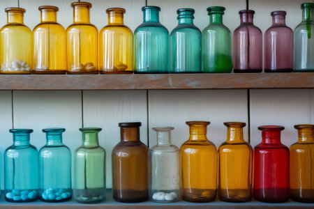 Antique glass bottles in various colors, some containing pills, neatly arranged on wooden shelves, showing a vintage pharmacy or apothecary setting
