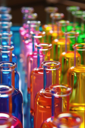 Small transparent bottles containing colorful chemical reagents are neatly arranged on a shelf, creating a gradient from blue to red to yellow