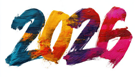 This striking artwork features a bold representation of the year 2026 with vibrant brushstrokes, combining colors that evoke creativity and celebration in an abstract style.