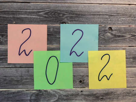New year 2022 is written on a multicolored, bright powder on a yellow background. Top view.