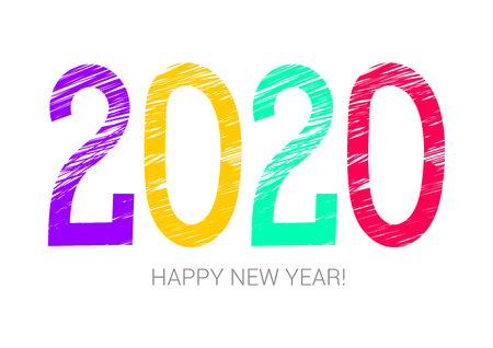 2020 year colorful symbol. Happy new year. Banner, card. Purple, yellow, green and red. Greeting card, poster. Chalk or pencil hand drawn. Doodle
