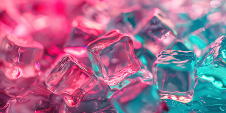 The vibrant ice cubes are glistening with water droplets, showcasing soothing hues of pink and teal tones
