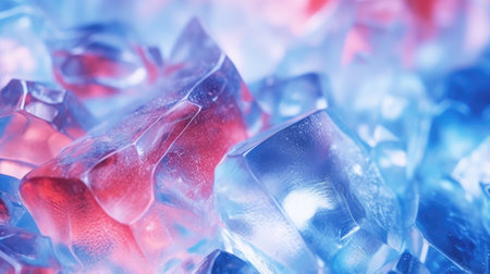 Colorful ice cubes create a stunning abstract backdrop, combining vibrant shades of blue, pink, and purple. Ideal for design or beverage themes.