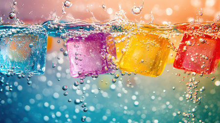 Vibrant ice cubes in bold colors underwater, highlighted by glowing bubbles and soft ripples in a crystal-clear liquid