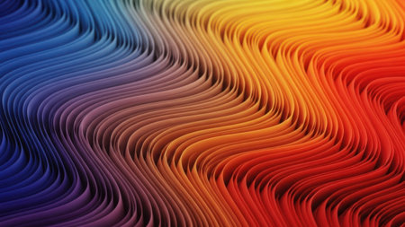 This image showcases a mesmerizing display of wavy patterns transitioning smoothly through a spectrum of vibrant colors. The waves start with deep blues and purples on the left, gradually blending into warm oranges and reds on the right. The fluid motion and seamless color gradient create a sense of harmony and continuity.
