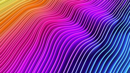 Rows of colorful red, pink, blue, orange and yellow stripes waving and swaying. Geometric abstract background with bright rainbow strips rippling 3D illustration. Vibrant motion graphics backdrop