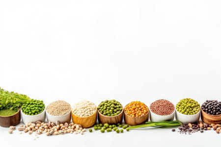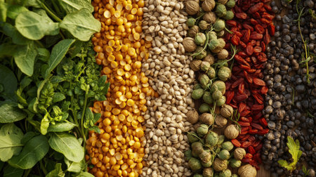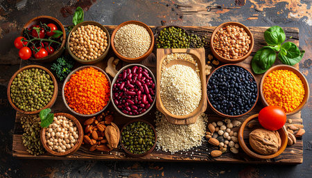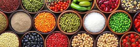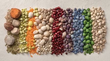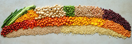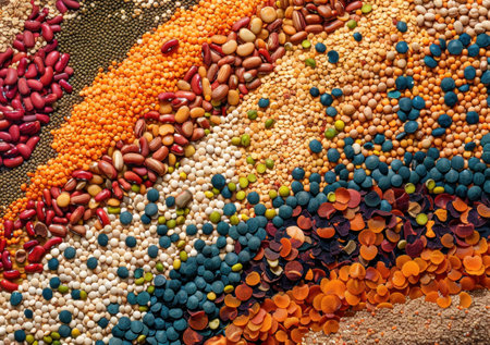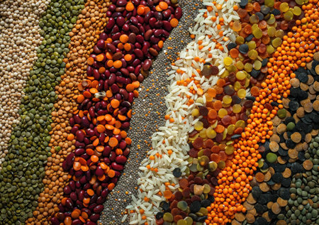 Colorful variety of grains and legumes arranged in a beautiful pattern. Organic ingredients create a vibrant backdrop, showcasing natures diversity in healthy eating.