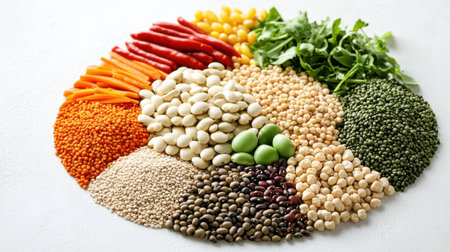 A vibrant display of fresh vegetables, grains, and legumes arranged artistically on a neutral background highlights the diversity of healthy foods.