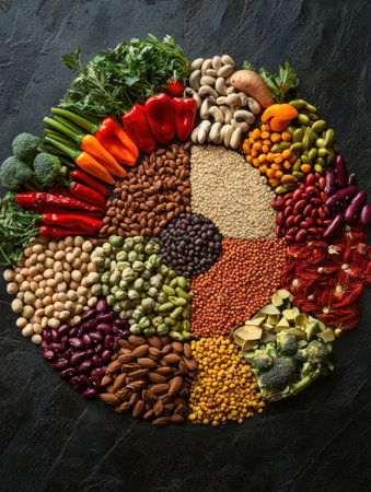 A vibrant and artistic display of fresh vegetables, grains, and legumes arranged in a circular pattern to promote healthy eating habits.