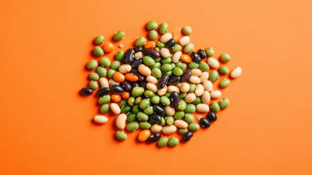 A vibrant display of various beans and peas scattered over a bright orange background, showcasing healthy eating options and culinary creativity.