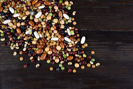 dried legumes and beans scattered on a dark background