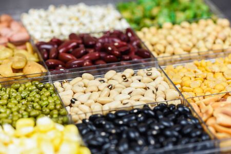 Collage various mix beans peas agriculture of natural healthy food for cooking ingredients / different whole grains mixed beans and legumes seeds lentils and nuts colorful snack , selective focus