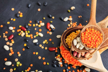 Healthy food concept. Assortment of legumes on black background