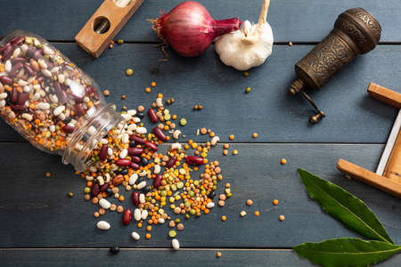 Healthy diet concept. Close up of assortment of legumes in a glass jar, spilled on a wooden tabletop background, pepper grinder, onion, garlic and grater.