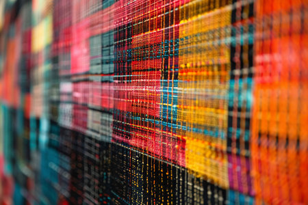 Woven rainbow wool creates vibrant textured backdrop generated by artificial intelligence