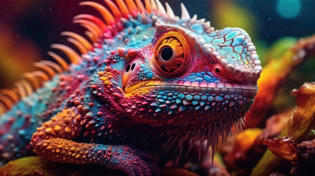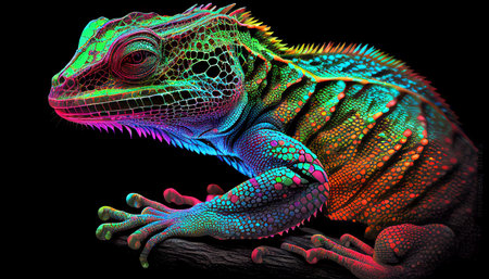 Mesmerizing close up of a neon colored reptile with a vibrant textured skin and scales set against a dramatic dark background creating a captivating and eye catching visual display