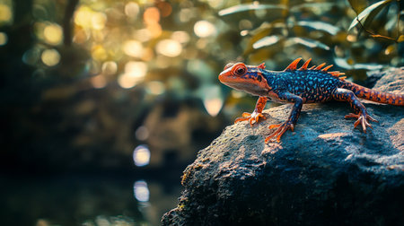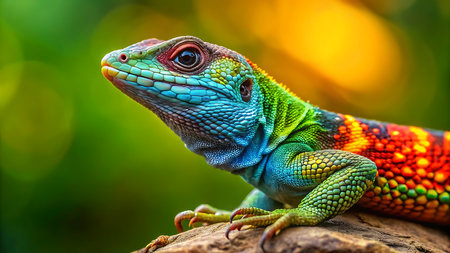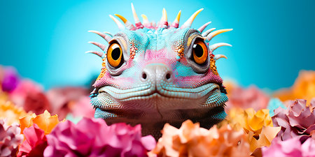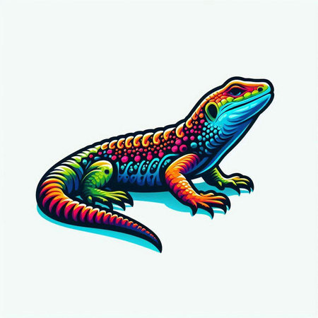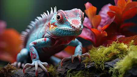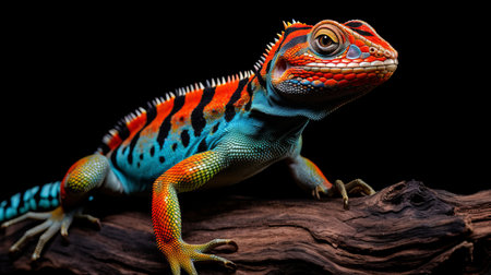 a colorful lizard showcasing vibrant colorism, resembling an acrobatic reptile, is captured in this national geographic photo. set against a black background, the lizard's striking features are enhanced in 8k resolution. its scales display a captivating blend of dark turquoise and light red, reminiscent of colorful woodcarvings. ai generated